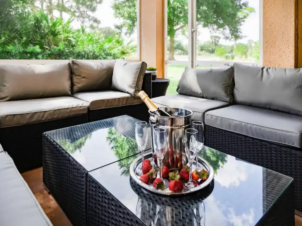 The living room has beautiful views over the golf Pitch and Putt area and is great for relaxing. Comes with a large sofa group, a table, and a large 75-inch Smart TV with Netflix, perfect for catching up on your favorite shows after a long day on the golf course or exploring the local area