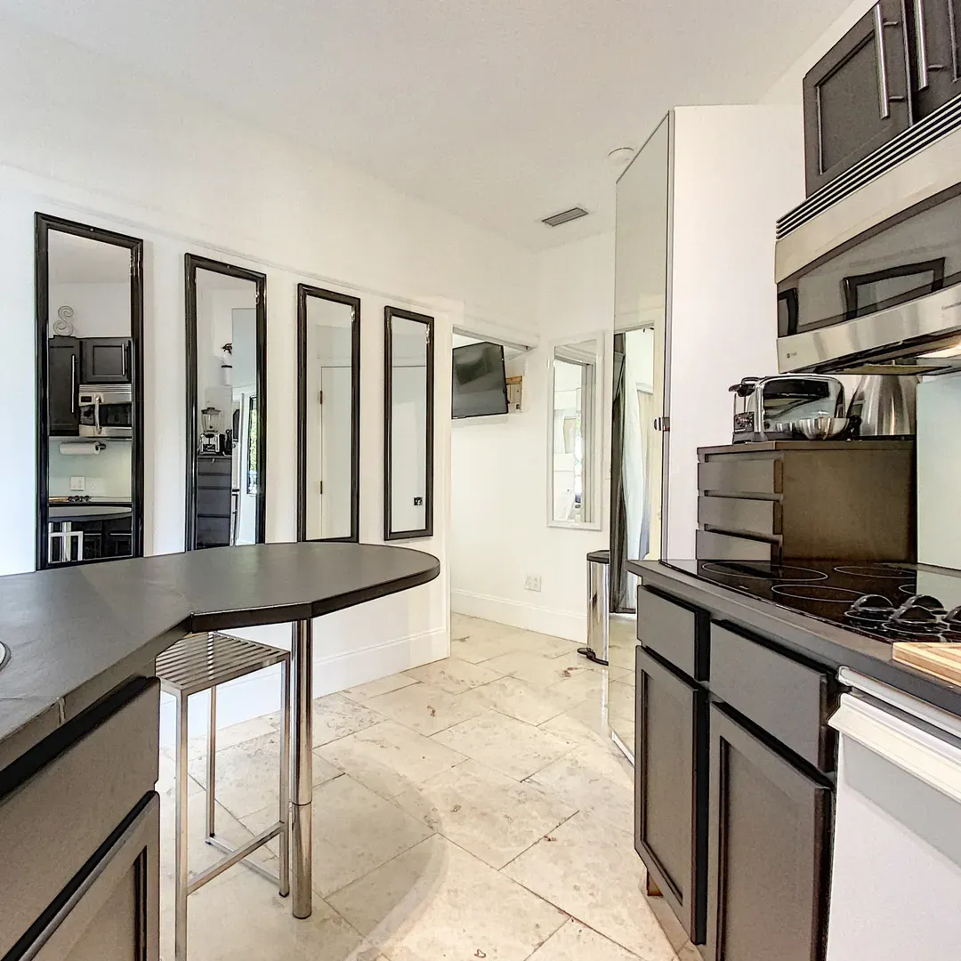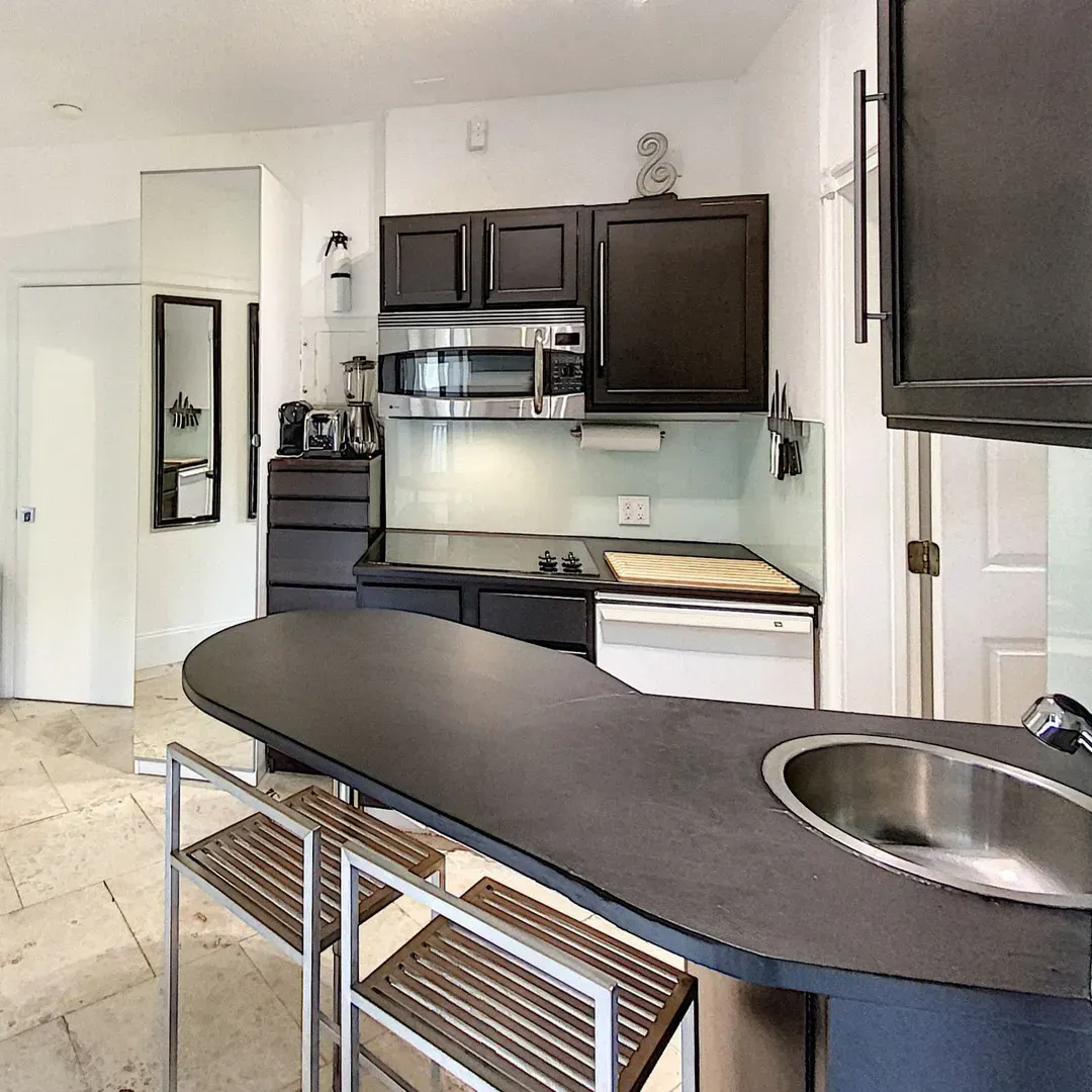 The fully equipped kitchen comes with a stove, oven, over-the-counter convectional microwave oven, fridge-freezer, dishwasher, coffeemaker, toaster, blender, pots & pans, cooking/eating utensils, iron, ironing board, ice-bucket, wine glasses, and an extra kitchenette bar with 2 chairs. Large-size dining table seating with 8 dining chairs. You'll have everything you need to cook up a storm and entertain guests.